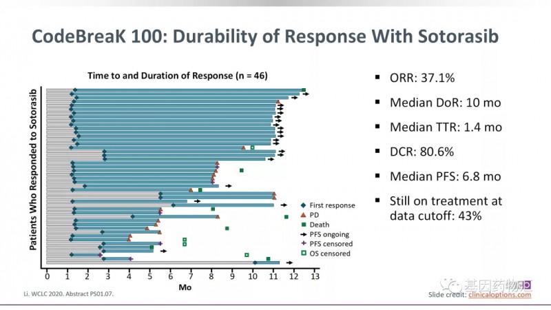 根据已经公布的Ⅱ期研究结果,使用Sotorasib治疗经治的KRAS G12C患者,整体缓解率37.1%,中位缓解持续时间10.0个月,中位无进展生存期6.8个月。