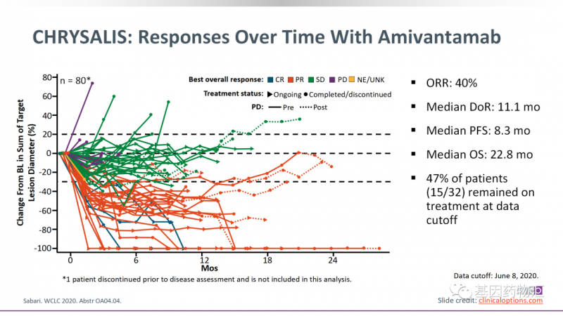 Amivantamab(JNJ-6372)治疗的整体缓解率为40%,中位治疗时间11.1个月,中位无进展生存期8.3个月,中位总生存期22.8个月。