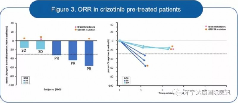 曾接受过克唑替尼治疗的患者(n=5):客观缓解率(ORR)为60%(3/5);疾病控制率(DCR)为100%(5/5)。5例患者中,3例患者ROS1 G2032R耐药突变阳性,且都有肿瘤缩小的表现;这意味着Taletrectinib能够有效的对抗一代ROS1抑制剂产生的耐药问题,给耐药的患者提供了全新的治疗选择。