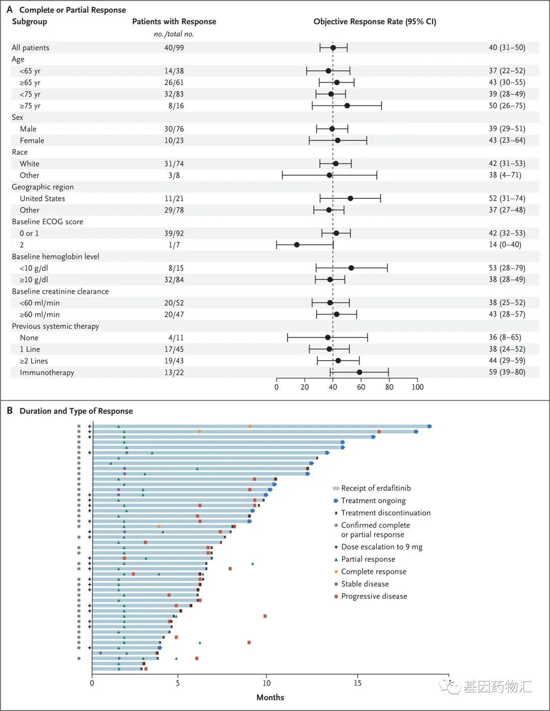 结果显示,厄达替尼治疗的整体缓解率为40%,其中包括3%的完全缓解和37%的部分缓解;中位无进展生存期5.5个月,中位总生存期13.8个月。