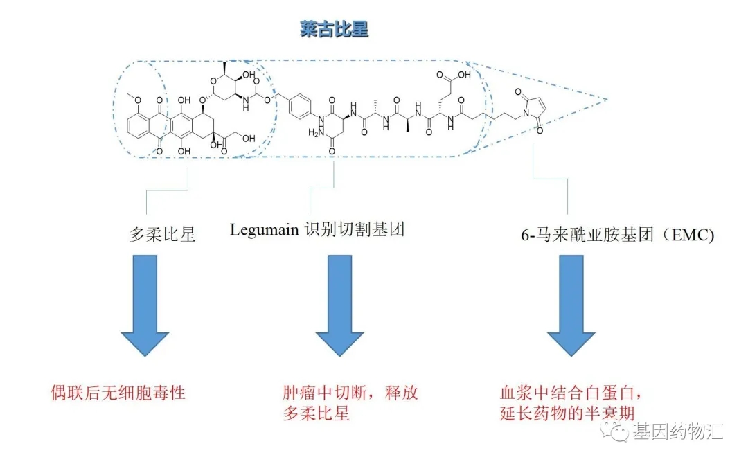 注射用莱古比星是一种新型的蒽环类化疗药物,将6-马来酰亚胺基团(EMC)与四肽氨基酸基团(ALA-ALA-ASN-LEU)连接,并与多柔比星相偶联。