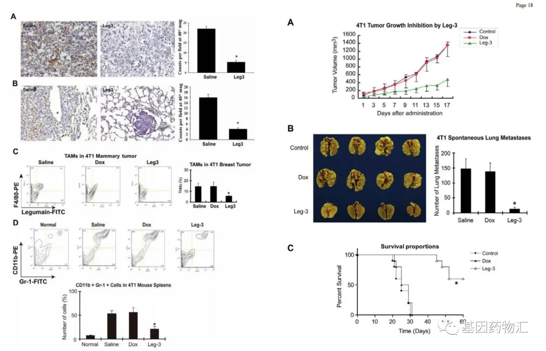 研究中对比了采用多柔比星联合治疗与采用莱古比星联合治疗后的肿瘤部位浸润TAM及MDSC含量,结果显示,采用莱古比星联合治疗后小鼠肿瘤部位TAM与MDSC显著低于多柔比星。