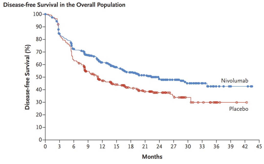 从下图能够看出,使用免疫治疗的群体的中位无疾病生存期是22.4个月,而对照的安慰剂组只有11个月,延长了接近一年,降低了31%的复发或死亡风险。