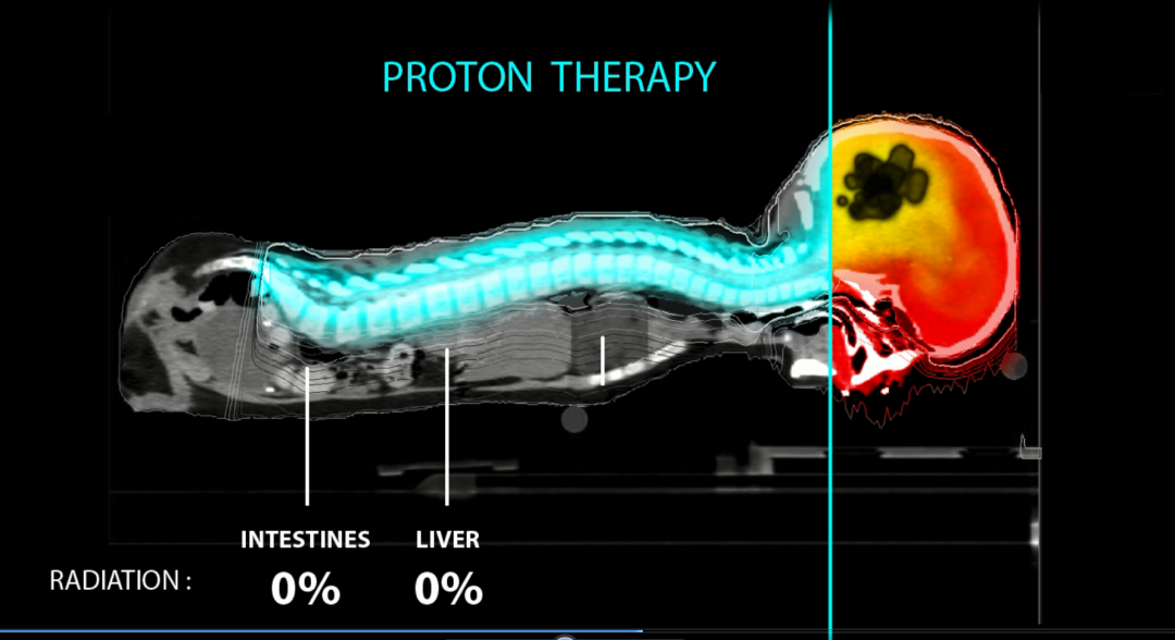 与传统形式的辐射相比,质子束会到达肿瘤内部的精准位置而不是沿着光束离开人体的路径释放大部分辐射剂量。实际上,质子没有肿瘤之外的辐射“退出剂量”,这意味着质子停在肿瘤上,不会继续伤害身体的健康部位。