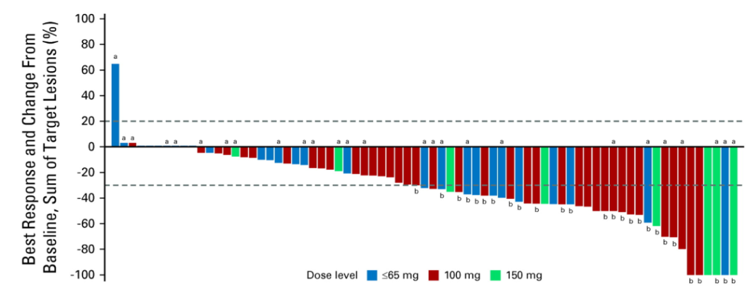 值得注意的是,在每天两次接受100mg药物治疗的39名患者中,确认的部分缓解(PR)率为41%,另外22名患者(56.4%)病情稳定。