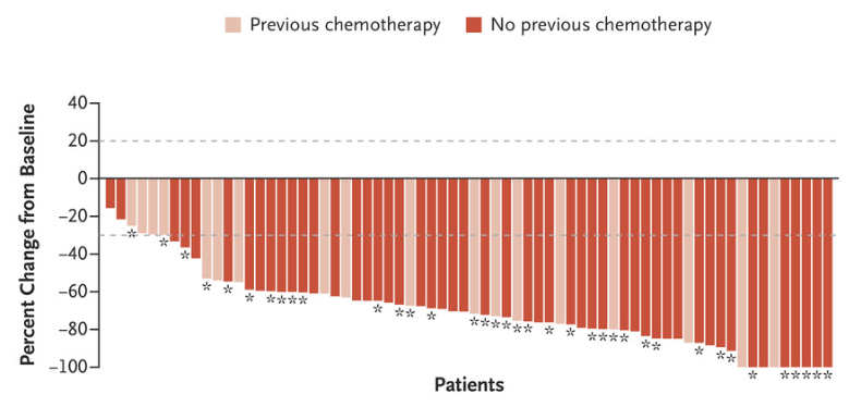 71名未接受ROS1TKI治疗的非小细胞肺癌患者,总客观缓解率(cORR)为79%,其中7名患者(10%)达到完全缓解(CR);49名患者(69%)达到部分缓解(PR)。疾病控制率高达94%!