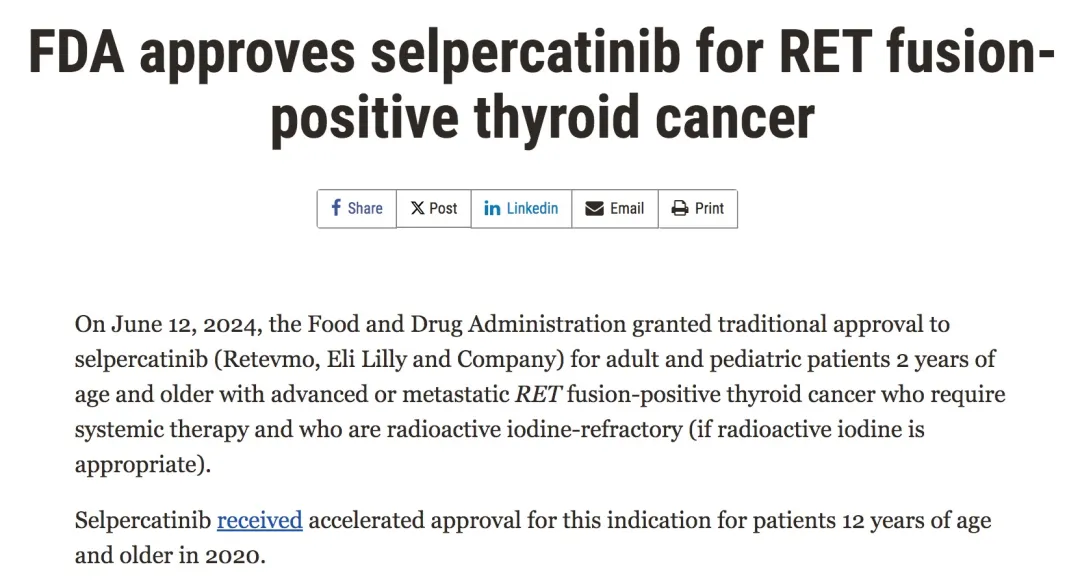 2024年6月12日美国食品药品监督管理局(FDA)宣布加速批准塞尔帕替尼胶囊(赛普替尼、Selpercatinib、LOXO-292、Retevmo)用于治疗需要全身治疗且对放射性碘有抵抗力的晚期或转移性RET融合阳性甲状腺癌成人患者;2岁及以上的RET突变和RET融合的儿童甲状腺癌或实体瘤适应症已于2024年5月29日获批。这一消息为RET融合阳性甲状腺癌患者带来了新的希望,尤其是那些对传统治疗无效的患者。