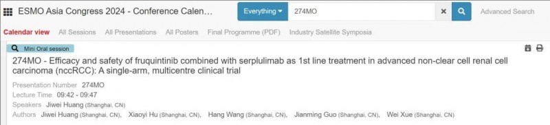 [5]Jiwei Huang(Shanghai, CN),et al.274MO - Efficacy and safety of fruquintinib combined with serplulimab as 1st line treatment in advanced non-clear cell renal cell carcinoma (nccRCC): A single-arm, multicentre clinical trial.2024 ESMO Asia. Abs 274MO.