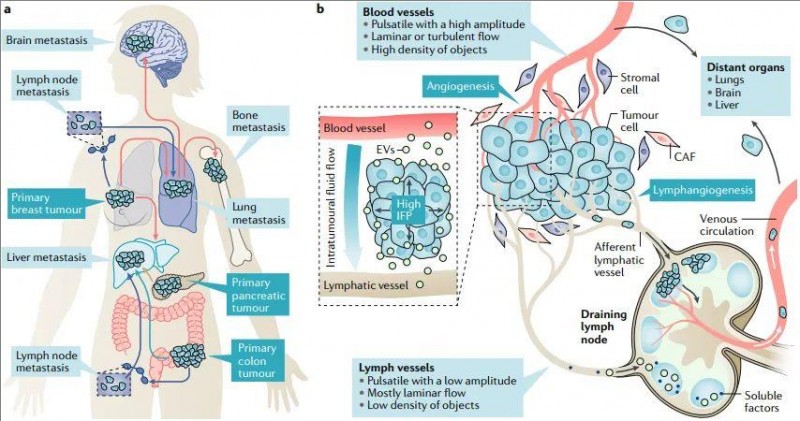 肿瘤的转移是由一系列的动态事件所组成的,最终会使得癌症患者的存活率大大降低。为转移至远端器官,肿瘤细胞及其相关因子会借助多种体液系统,在机体内实现传播。例如,血液和淋巴循环系统的流动机制,就常被癌细胞利用,以提高自身从原发肿瘤处外渗和转移的效率。在这一过程中,体液的流速、血管大小以及剪切应力等因素,都会对循环中癌细胞的存活率产生影响。