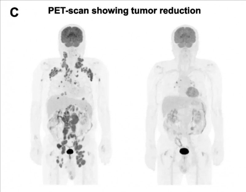 该患者确诊为滤泡中心淋巴瘤,曾接受过高剂量化疗,但效果不理想,病情仍然复发。入组接受帕米膦酸盐和低剂量IL-2,在体内刺激γδT细胞治疗后,CT检查显示,大多数淋巴结没有明显变化,且皮肤转移及纵隔淋巴结消退(详见下图)。仅有1个淋巴结增大,病理活检显示该淋巴结主要为纤维化,仅剩下少量淋巴瘤细胞。在此之后,肿瘤质量稳步下降,最终经过19个月的治疗,该患者达到部分缓解(PR)(详见下图)。