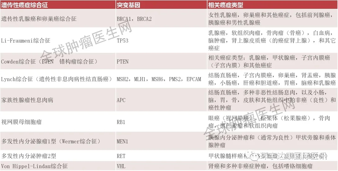 那么如何知道自己是不是有遗传性致癌突变呢?可以通过基因检测来评估,下面的列表包括一些可用于基因检测的最常见的遗传性癌症综合征,每种综合征中突变的基因,以及最常与这些综合征相关的癌症类型。