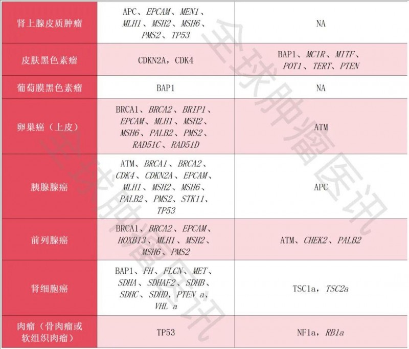 ▼推荐检测并纳入特定癌症多基因检测组合的基因一览