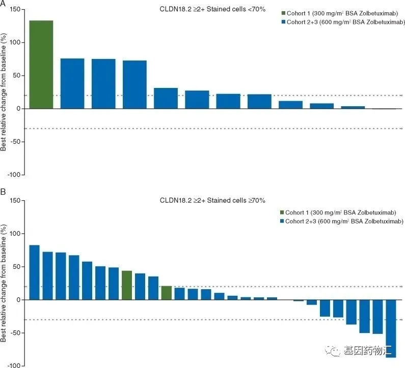 在2019年公开的Ⅱ期研究数据中也证实,Zolbetuximab治疗晚期胃癌或胃食管交界处癌或食道腺癌患者,临床获益率达到23%。同时,从分组分析中可以明显地看出,Zolbetuximab对于Claudin 18.2表达水平更高、尤其是表达水平≥70%的患者疗效更加显著。
