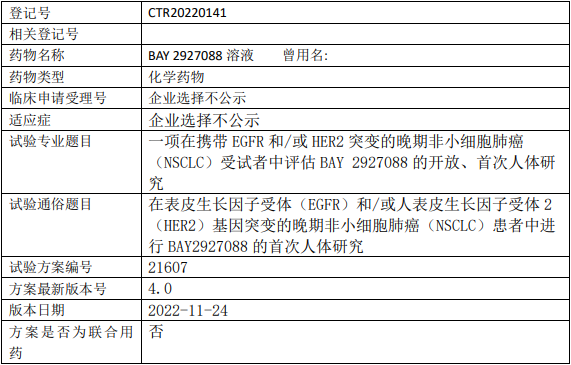 拜耳医药BAY2927088临床试验,评估BAY 2927088溶液治疗携带EGFR和/或HER2突变的晚期非小细胞肺癌的I期临床试验