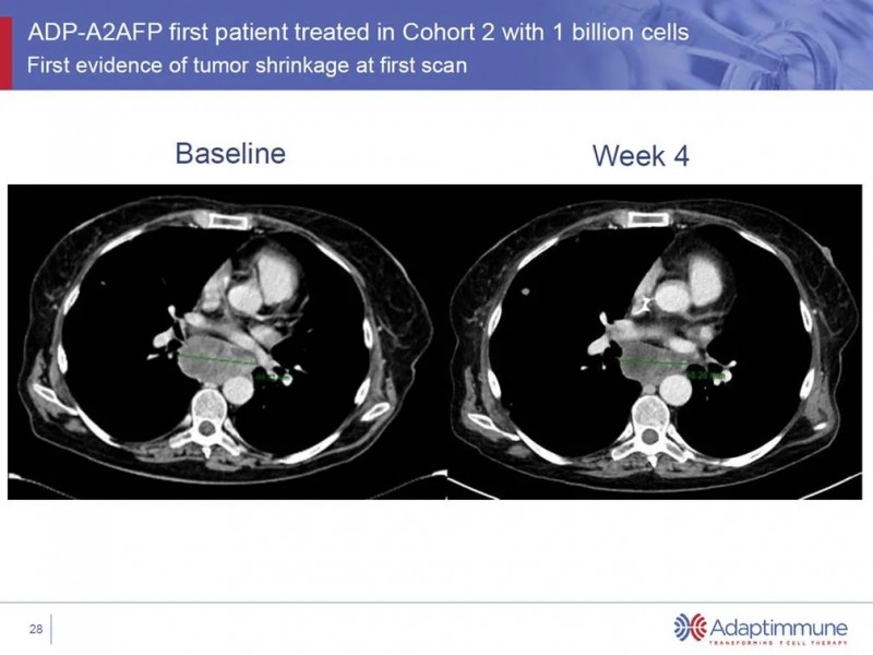 会议上报道了一位67岁的男性晚期滑膜肉瘤患者,MAGE-A4高表达(100% 3),接受9.95*10^9ADP-A2M4 T细胞治疗12周后,最大的肿瘤病灶(155mm)缩小了45%,随着进一步的治疗,肿瘤缩小了71%。
