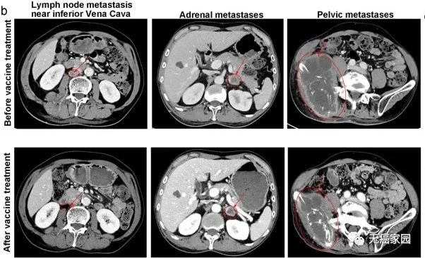 图中患者靠近下腔静脉的转移瘤基本消失,肾上腺转移及盆腔巨大转移灶明显缩小
