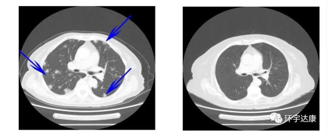其中一位晚期骨肉瘤患者已经出现了双肺转移,TIL加抗PD1治疗后12周后双肺多个转移(蓝色箭头)完全缓解。