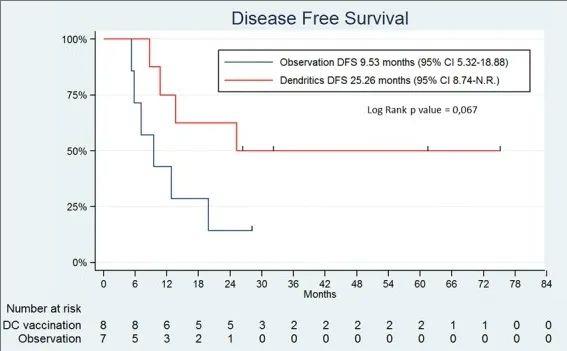 结果显示:疫苗组复发风险显著降低,DC疫苗组中位无病生存期(DFS)为25.26个月(95%CI,8.74个月-未达到),而观察组仅为9.53个月(95%CI,5.32个月-18.88个月)(详见下图)。显然,疫苗组复发次数明显减少,且复发时间更晚。