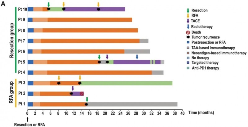 值得一提的是,其中一例患者(病例1)在根治性肝切除术后7个月,虽出现肝内复发。但经经射频消融(RFA)治疗后,连续42个月未再复发。